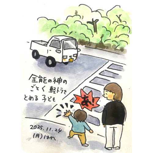 お母さんと横断歩道に立つ赤ちゃんが突然勇ましくやってくる軽トラに向かって手をあげ かわいい声で「あ!!!」と叫んだ。